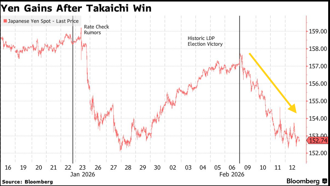 BBG - The yen is on track for its biggest weekly gain since November 2024 on confidence Prime Minister Sanae Takaichi’s election victory will allow her to expand fiscal stimulus while maintaining the trust of financial markets.