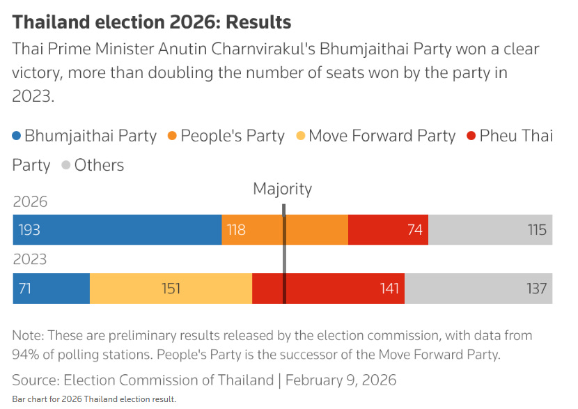 Anutin-led Bhumjaithai romped to a surprise victory on Sunday securing 193 seats in the 500-member House of Representatives, followed by the reformist People’s Party with 118 seats and the populist Pheu Thai at 74, according to Reuters’ calculations based on election commission data.