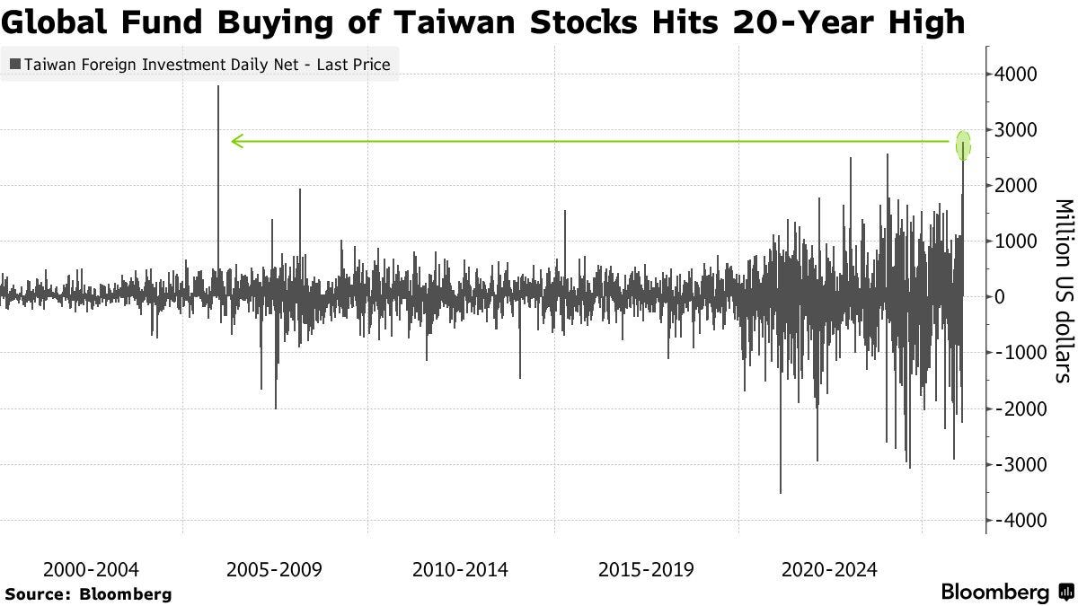 BBG - Overseas investors bought a net $2.77 billion of Taiwan equities on Tuesday, the most since December 2005, according to data compiled by Bloomberg. The investment also marked a sixth straight day of buying by foreign funds.