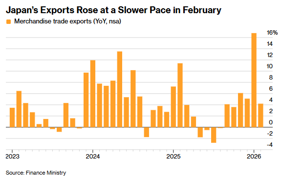 The value of overall exports rose 4.2% in February from a year earlier, after a big jump in the previous month, the Finance Ministry reported Wednesday. The result beat the median analyst forecast of a 1.9% rise.