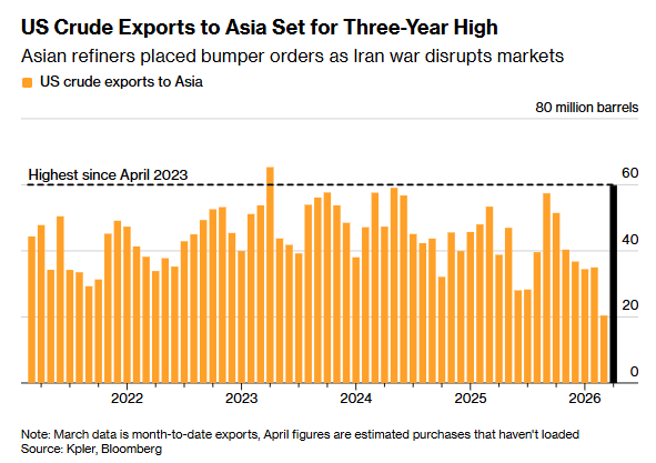 BBG - Asian buyers also have scooped up the most US oil in three years, as the Strait of Hormuz crisis spurs a hunt for alternatives to Persian Gulf crude.