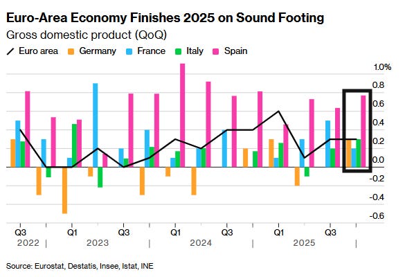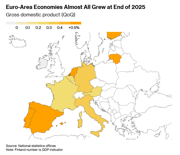 For France, while the full year was a very solid +0.9%, the second half of 2025 was clouded by another government collapse and rows over tax hikes and spending cuts that are needed to rein in a gaping budget deficit. Fourth-quarter investments still increased by 0.2% while consumer-spending growth accelerated to 0.3%. “We’re off to a good start in 2026,” Finance Minister Roland Lescure said on TF1 television. “I hope we’ll get at least the 1% (growth) we’re expecting.” Prospects for a strong rebound remain limited, economists say. The budget "remains unfavourable to businesses" and higher taxes could curb investment and job creation, ING economist Charlotte de Montpellier said in a note. She described the overall outlook as “modestly positive,” citing early signs of improving business confidence, though a strong euro could hinder exports.