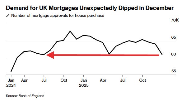 UK households scaled back their borrowing in December for the first time in three years, suggesting sentiment remained cautious going in 2026 in a potential warning sign for the tepid British economy. Banks and building societies authorized 61,013 home loans, down from 64,072 in November and the lowest for 18 months, the Bank of England said Friday. It was the first December fall since 2022, surprising economists who on average had expected a modest increase to 64,900. The central bank also said consumers borrowed an extra £1.5 billion ($2.8 billion) of unsecured debt, less than economists forecast. The figure was down from an unusually high £2.1 billion in November and weaker than the months leading up to Chancellor of the Exchequer Rachel Reeves’ Nov. 26 budget when fears of tax rises weighed heavily on household spending decisions. Credit card borrowing and “other” loans such as car finance both posted declines last month. “December’s money and lending data suggest that households’ caution with their borrowing and saving hasn’t gone away, reinforcing our view that consumer spending will underperform consensus expectations in 2026 and 2027,” said Ruth Gregory, deputy chief UK economist at Capital Economics.