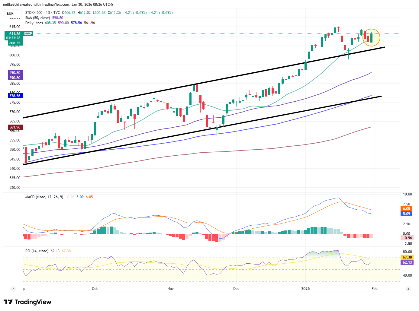 Europe’s benchmark STOXX 600 as of 8.20 am ET was up +0.7% as it continues to trade just below all-time highs on track for a fifth weekly gain in six closing out its 8th straight month of gains. Major Major European indices also trade in the green with banks contributing to the strength.
