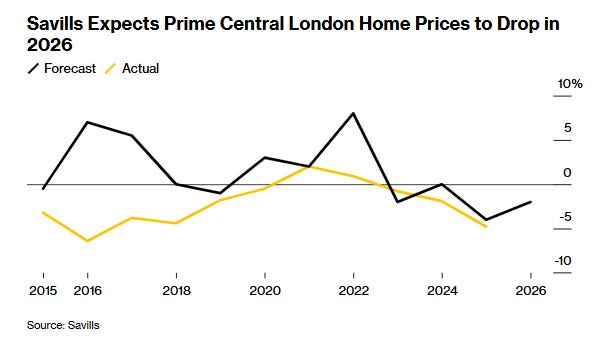 London’s top property brokers, who have overestimated house price growth in the city’s priciest neighborhoods for years, have finally thrown in the towel. Savills Plc — which cumulatively overestimated prime central London house price growth by a margin of 42.7% percentage points in the 11 years through 2025 — now sees back-to-back annual declines. It’s the first time it has made such a gloomy prediction since the aftermath of the global financial crisis. The broker predicted that prices would drop 4% in 2025 — its most bearish call in years — though that was still a slight underestimate. It sees prices falling another 2% this year and failing to rise again until 2028. It’s a striking reversal. Since the downturn began in 2015 the broker saw prices rising a cumulative 18 percentage points when in fact they’ve fallen by 24.7 points. To be sure, a series of shocks in years when Savills had expected robust growth, including the Brexit vote, the coronavirus pandemic and Russia’s invasion of Ukraine that triggered new transparency rules for UK property, account for much of the aggregate overestimate.