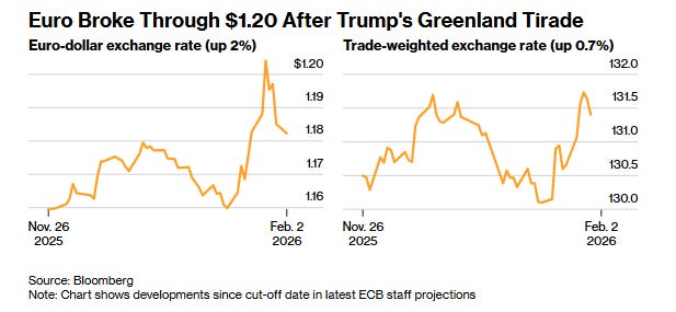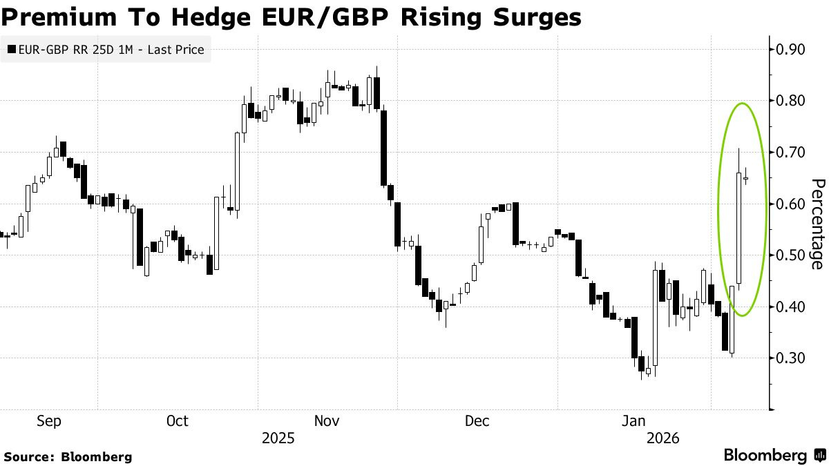 Sterling fell 0.5% to 0.8725 per euro on Monday, the lowest since Jan. 22. Hedge fund flows into “euro-pound remained one‑way, with heavy topside buying,” said Thomas Bureau, global head of FX option trading at Societe Generale, referring to demand for call options following the market moves on Feb. 5. “The pound has traded with EM‑style volatility, driven by global dollar strength and hypersensitivity to geopolitical headlines.”