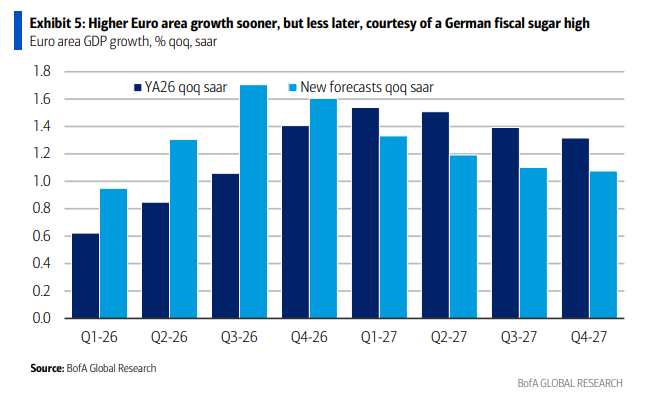 BoA raises their growth forecasts for the EU to 1.2% (+20bp) for 2026 but cut to 1.3% (-10bp) for 2027, reflecting a strong, but short-lived German fiscal growth peak (inflation and ECB forecasts below for subscribers):