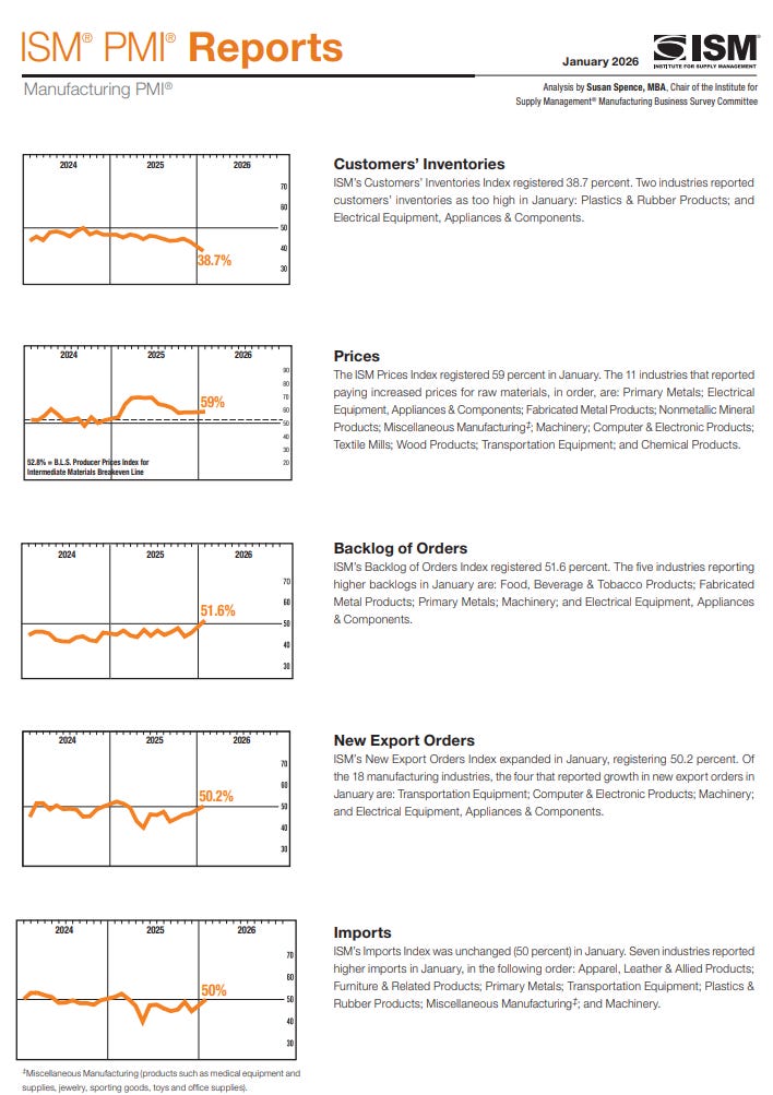 On new orders: “This reading is above the 12-month average (48.5 percent)…the highest since it registered 59.7 percent in February 2022.” “Of the six largest manufacturing industries, four reported increased new orders [up from one in Dec]. For every negative panelist comment about new orders, two comments indicated optimism about near-term demand. A number of comments, however, mentioned post-holiday replenishment and customers’ desire to get ahead of additional tariff-driven price increases as possible reasons for the increase,” said Susan Spence, Chair of the ISM Manufacturing Business Survey Committee. Eight industries reported growing new orders (up from two in Dec, six in Nov) while 7 reported declines (down from 13). An index above 52.1 percent, over time, is generally consistent with an increase in the Federal Reserve Board’s Industrial Production figures.