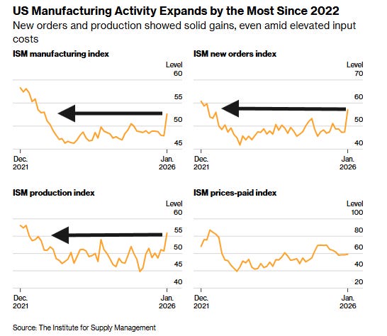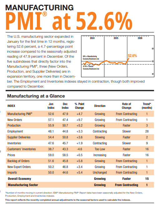 Like its S&P counterpart (which is generally smaller companies than the ISM survey and more domestic focused) which remained in expansion for the 12th month in 13 and accelerating to a 4-month high of 52.4, ISM’s Jan manufacturing #PMI, moved into expansion (over 50) for the first time in a year (since Jan ‘25, which was the first time since Sep ‘22) +4.7pts to 52.6, the best since Aug ‘22 after contracting in Dec the most since Oct ‘24. The reading was well above expectations for 48.5 and the 12-mth average of 49.1.