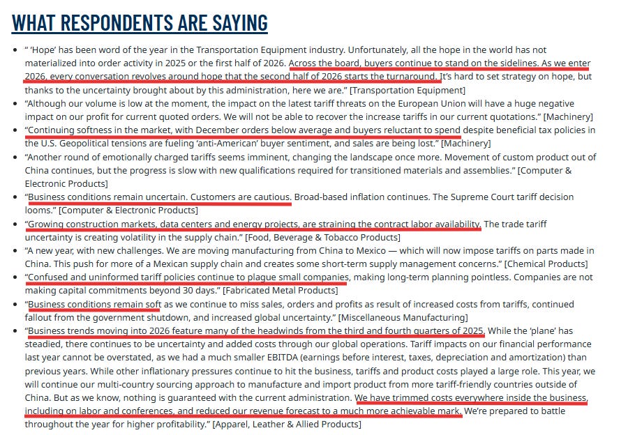 Most also commented on weak sales/business activity, although a little less than December. Still only one mentioned strong sales and it was related to data centers which are “straining contract labor availability.”