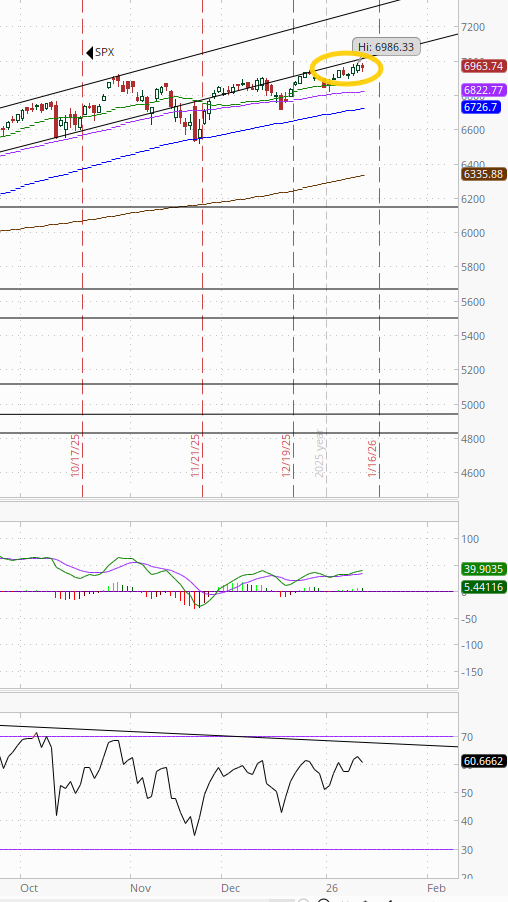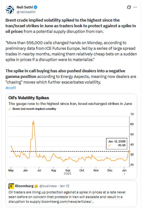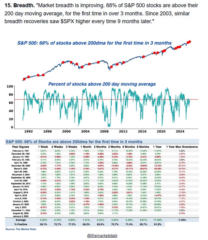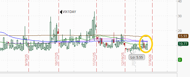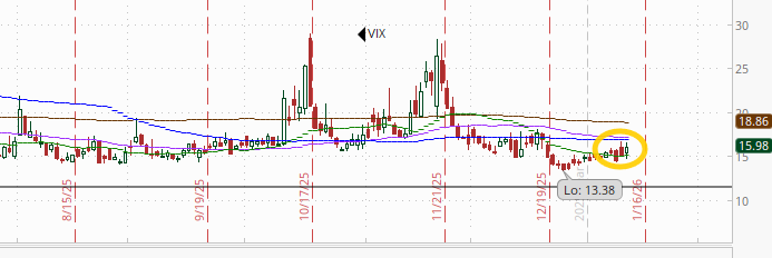 ~17 SPX components were up 3% or more (after 20 Mon, 45 Fri, 70 Thurs, 12 Wed, 75 last week). In a pivot away from 2025 leaders Moderna MRNA (one of 2025’s big losers) led +17.0%. Three of those 17 were >$100bn in market cap (after 2 Mon, 15 Fri) in INTC, AMD, ANET (in descending order of percentage gains).