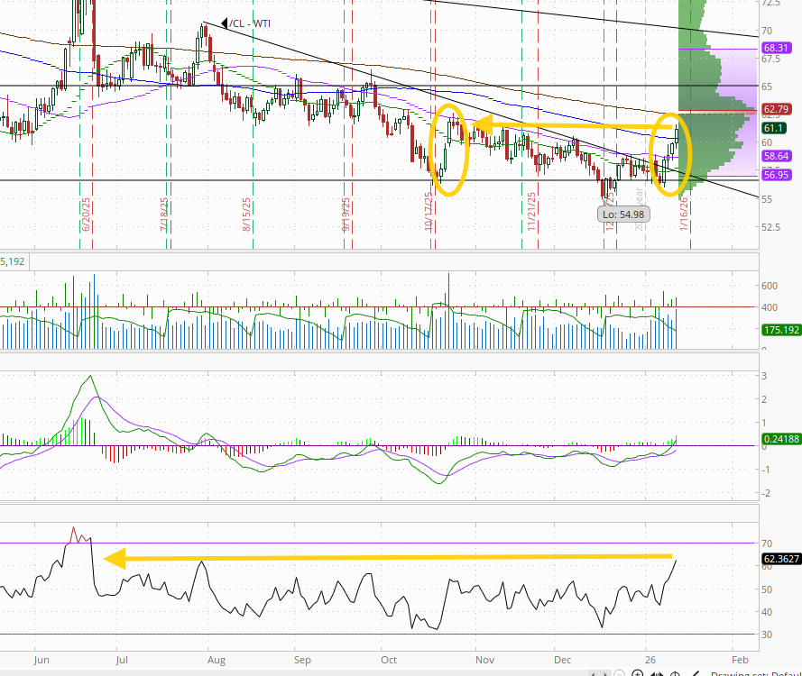 As I said Friday, “a green day on Monday would have me looking at the $62.50 level (200-DMA). Daily MACD remains supportive (cover shorts) and RSI is strongest since October.” RSI now the best since June.