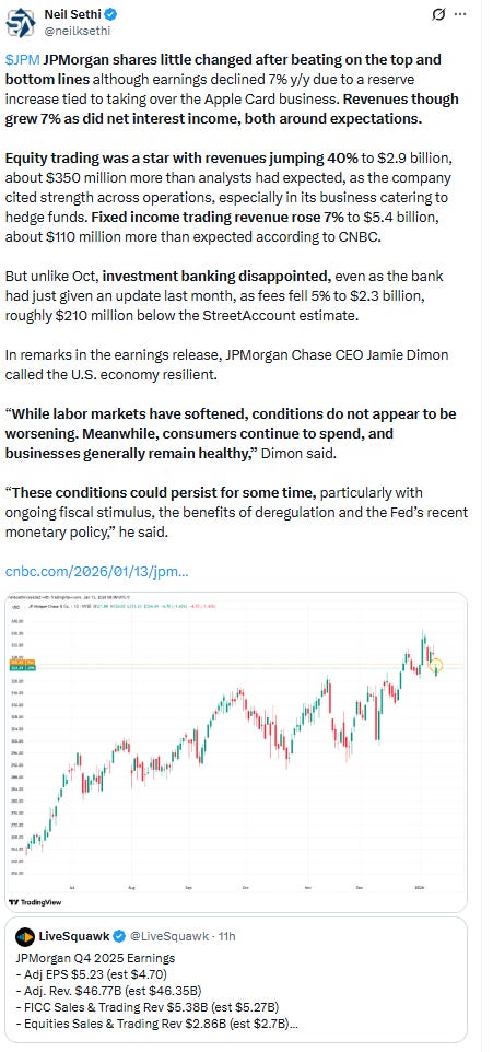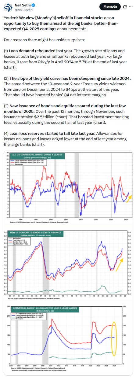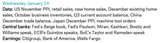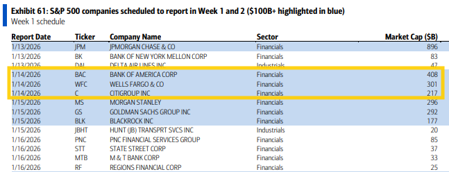 Q4 SPX earnings season continues with another 3 SPX reporters, but all over $100bn in market cap in the other three “Big Four” banks (BAC, WFC, C (in order of market cap)).