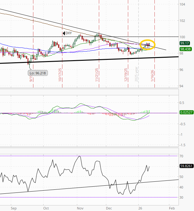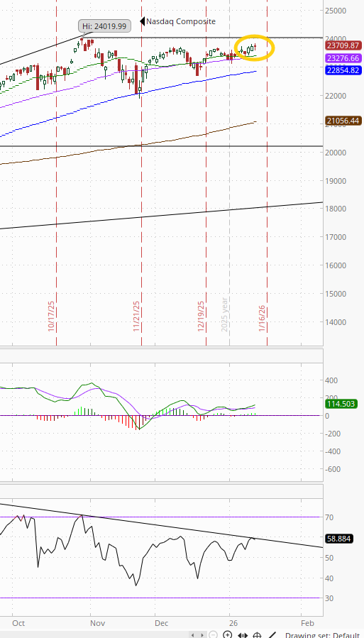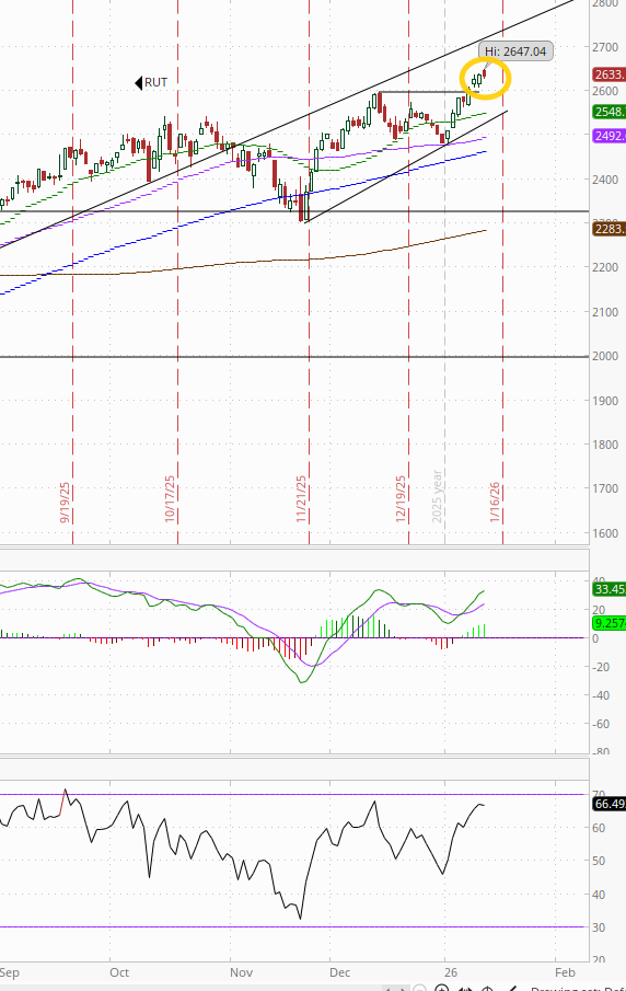 RUT (Russell 2000) remains the best chart of the bunch although taking a pause from its rebound from its 50-DMA hit Thursday. Its MACD as noted Wed did cross to a “go long signal” and the RSI is now over 60.