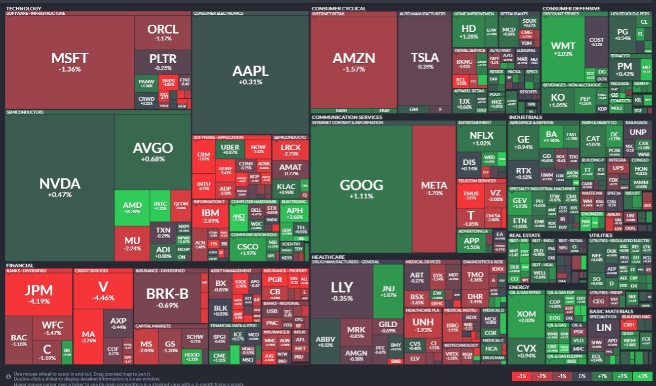 The company’s CFO, Jeremy Barnum, also signaled that the banking industry could push back against Trump’s call for a one-year 10% cap on credit card interest rates, which he declared late Friday. Goldman Sachs followed JPMorgan lower, declining more than 1%. Other financial stocks such as Mastercard and Visa lost 3.8% and 4.5%, respectively, putting them among the day’s worst performers. The State Street Financial Select Sector SPDR ETF (XLF) and Invesco KBW Bank ETF (KBWB) were under pressure as well.