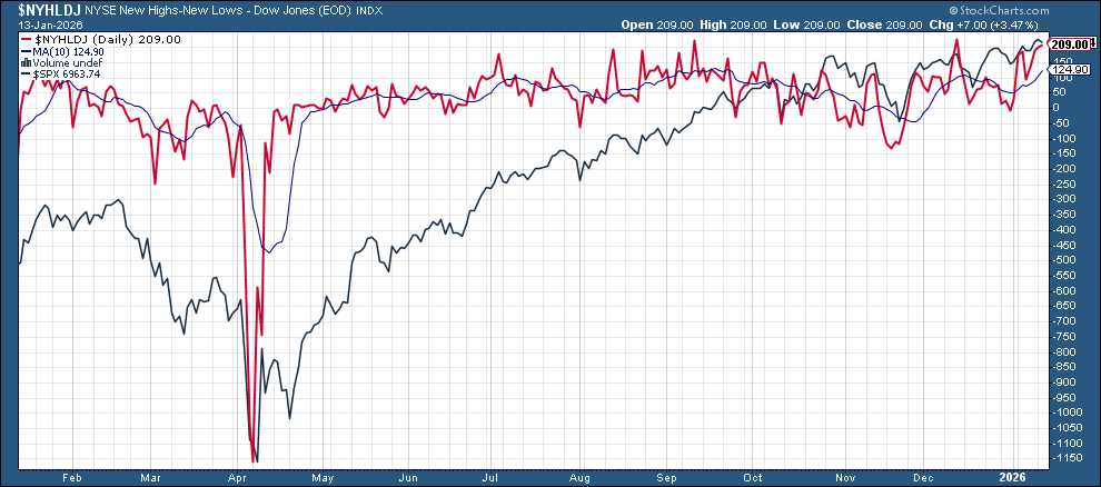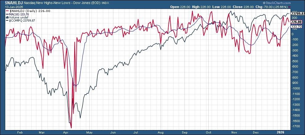 New 52-wk highs minus new 52-wk lows (red lines) were mixed improving slightly on the NYSE to 209, the second highest since Aug, but pulling back on the Nasdaq to 226 from 304.