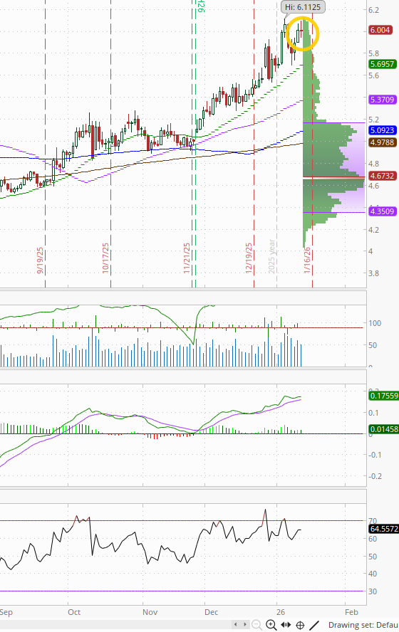 US copper futures (/HG) also little changed just under its all-time high. Daily MACD remains in “go long” positioning while the RSI still has a negative divergence (lower high).