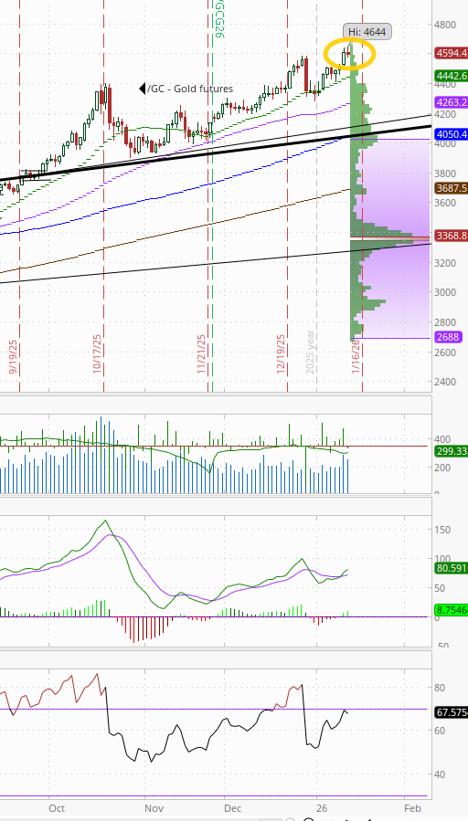 Gold futures (/GC) little changed after hitting an all-time high Monday. Daily MACD remains in “go long” positioning, while the RSI is over 60.