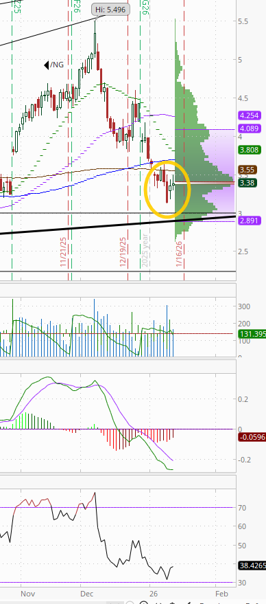 Natgas futures (/NG) continued to stabilize just below the $3.50 level after falling Friday to the lowest close since mid-October (and down around -45% from the peak Dec 5th).