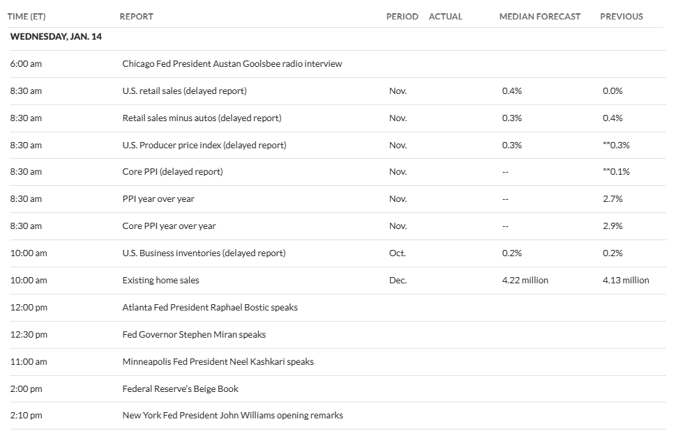 US economic data remains heavy Wed with delayed (Nov) retail sales and PPI reports along with Oct business inventories and an on-time Dec existing home sales report in addition to weekly mortgage applications and EIA petroleum inventories.