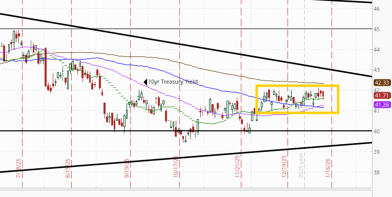 The 10yr #UST yield remained little changed as has been the case all year at 4.17%, remaining at the top of its range since the start of December. As noted Friday, it has traded in a 10bps range since then despite all of the headlines (including today’s).