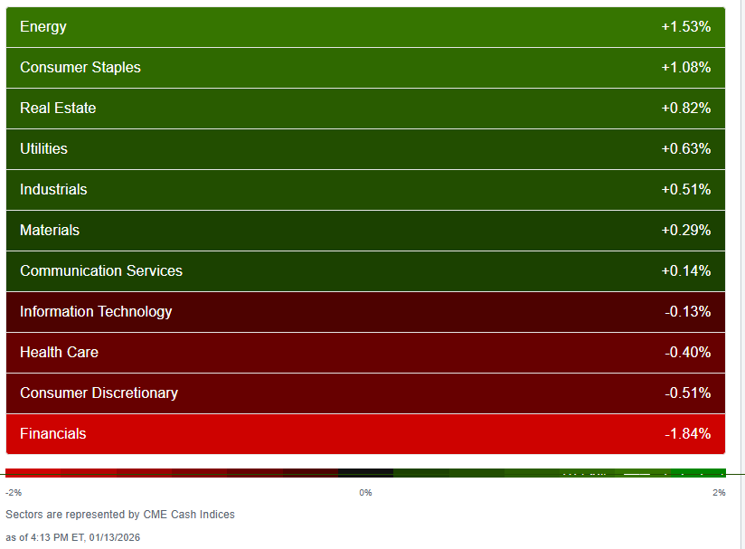 US equity indices opened with marginal gains (other than the DJIA which was lower as its financials and software names were under pressure) after a cooler than expected CPI report which though only modestly boosted expectations for Fed rate cuts (and saw no change to a very low probability for a Jan cut). Investors were also digesting the first of the big bank earnings from JPMorgan, which vacillated between gains and losses (and would later fall -4%) even after the largest bank in the nation posted better-than-expected results. Delta Air Lines, however, shed more than 1% premarket on mixed results (and would also end much lower).