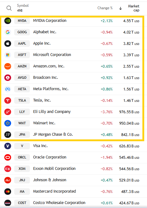 6 of the largest 11 SPX components were lower (from all 11 Wed, matching Tues). LLY easily led to the downside -3.8%. No others down more than -1%. Leading to the upside was NVDA +2.1%, the only up over +1%.