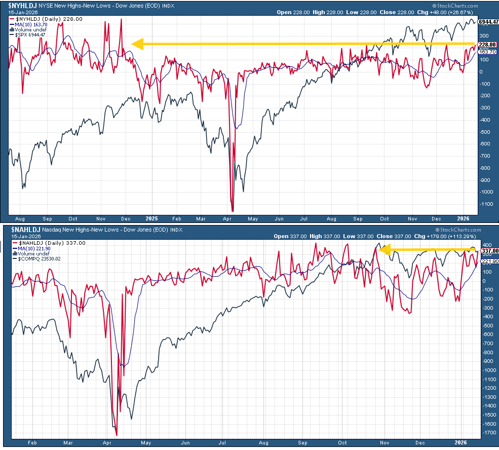 New 52-wk highs minus new 52-wk lows (red lines) though improved to 227 on the NYSE, the best since Nov ‘24, while the Nasdaq moved to 335, the best since Oct.