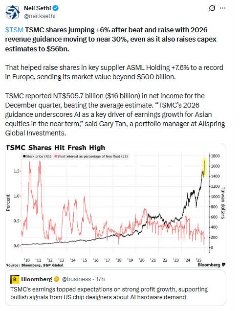 US equity indices opened higher after the first back-to-back losses for the SPX this year as the tech trade is back on track (at least as far as suppliers go) following Taiwan Semiconductor delivering another record quarter, reporting a 35% jump in profit, boosting its capital spending plans, and raising 2026 expected revenue growth to close to 30%. It would finish up over 6%. TSMC suppliers Applied Materials and Lam Research rose more than 7% in the premarket while ASML hit a record in Europe. Financials were also stabilizing after Blackrock reported a record quarter of asset inflows, while Goldman Sachs and Morgan Stanley both reported very strong results as well. They would build on early modest gains to finish up 4% and 6% respectively and new 52-week highs. We also got before the bell jobless claims which fell back, with initial claims falling to near 50-year lows.