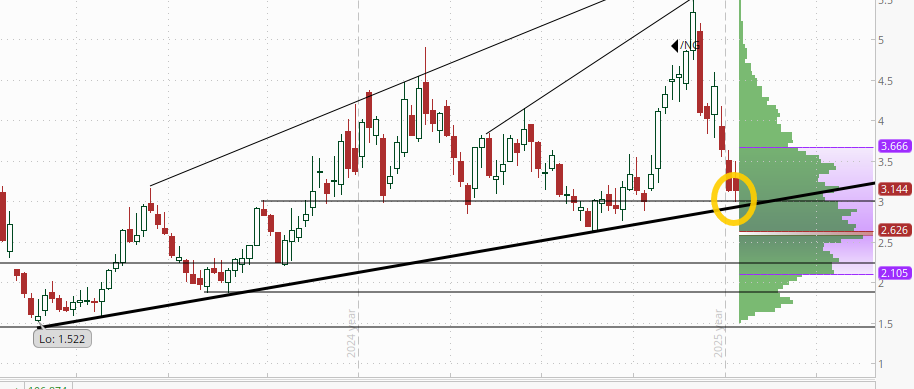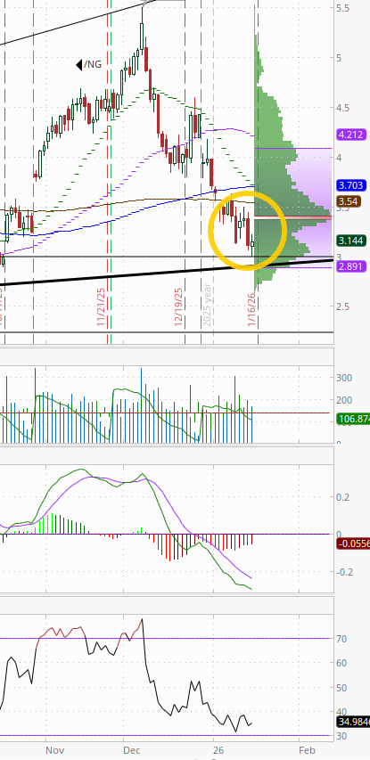 On natgas futures (/NG) I noted Mon, “we’ve seen bounces several times during this decline, so need to see more before I take the $3 target off,” and today they made it down to $3 where they found support as I had expected. That completed a nearly -50% drop from the peak Dec 5th. Just below is a major support line running back to the low in Feb ‘24 (second chart).
