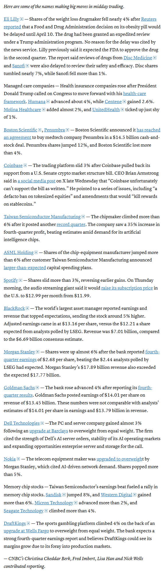 Bank stocks rose following the latest raft of quarterly earnings. Goldman Sachs advanced 4% after its fourth-quarter profit topped Wall Street estimates. Morgan Stanley jumped nearly 6% after its wealth management unit contributed to top and bottom line beats in the fourth quarter. Both stocks touched fresh 52-week highs.