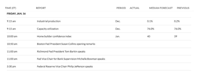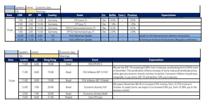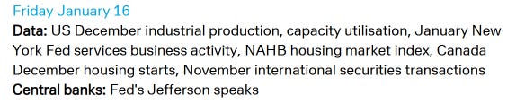 US economic data gives us our most complete look at manufacturing with Dec industrial production along with the Jan NAHB home builder confidence index (which I would imagine will get a lift).