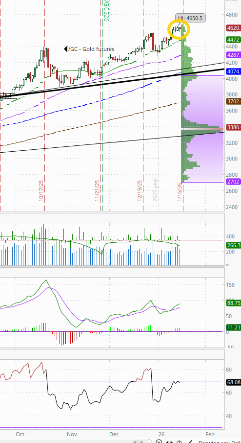 Gold futures (/GC) edged just off their all-time high. Daily MACD remains in “go long” positioning, while the RSI is over 60.
