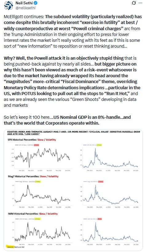 The current level is now consistent with “moderately elevated” daily moves in the VIX over the next 30 days (historically normal is 80-100, but we’ve been above 90 almost the entire time since July ‘24)). 100 is also a level flagged by Charlie McElligott as one to watch.