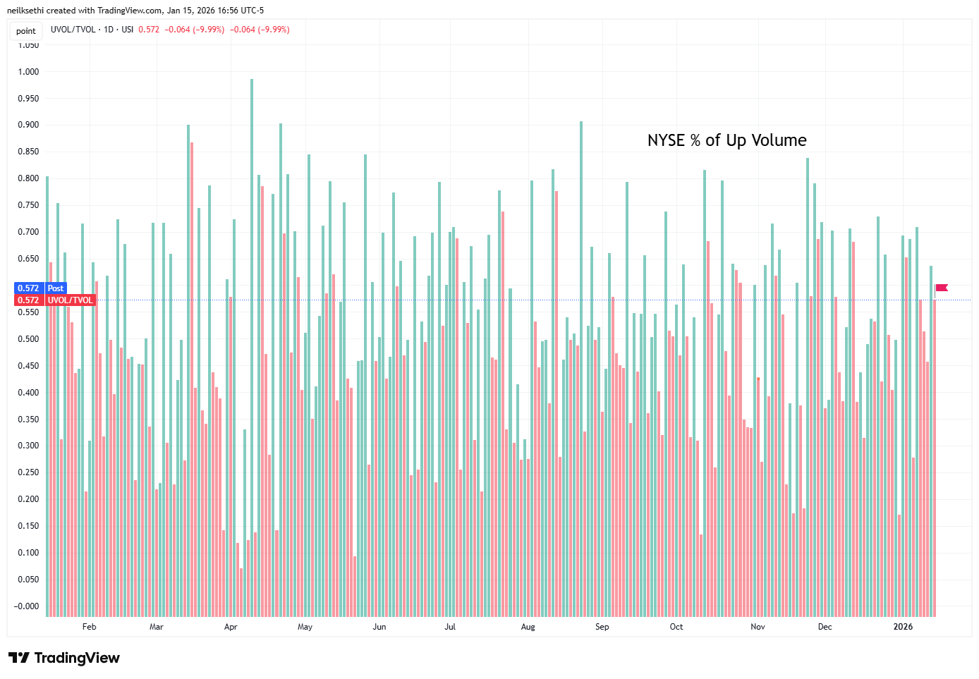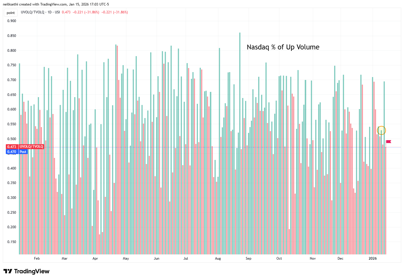 Positive issues (percent of stocks trading higher for the day), which are not inflated by high speculative volumes, though didn’t reflect it today with the Nasdaq actually higher than positive volume at 54%, down a touch from the 55% Wed, while the NYSE was 66%.
