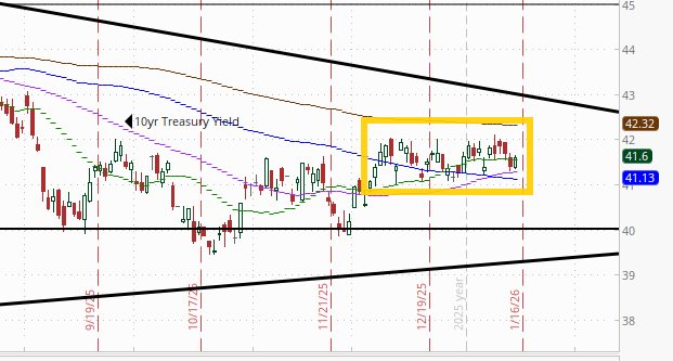 The 10yr #UST yield edged up to 4.16%, in the middle of its range since the start of December. As noted Friday, it has traded in a 10bps range since then despite all of the headlines, movement in Fed rate cut expectations, etc.