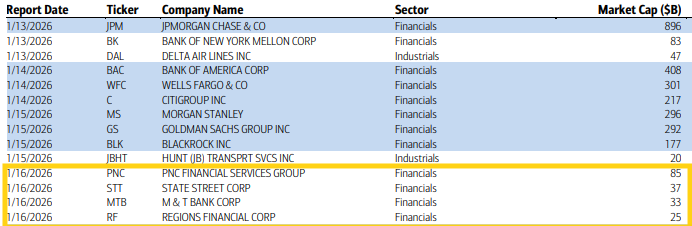 Q4 SPX earnings season continues Fri with another 4 SPX reporters, all of which are regional banks and none of which are over $100bn in market cap in PNC, STT, MTB, RF (in order of market cap).