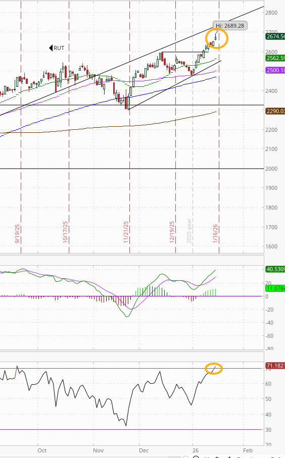 RUT (Russell 2000) remains the best chart of the bunch continuing on its rebound from its 50-DMA hit two weeks ago with another ATH. Its MACD as noted last week did cross to a “go long signal” and the RSI is now dipping a toe in overbought territory.