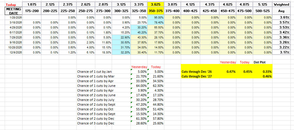 Pricing for 2026 dropped to 45bps (as noted Thurs under two cuts for the first time), with pricing for two cuts 58% and three cuts 26% (down from 68bps Dec 3rd (and 80bps mid-Nov which was highest we’d been for 2026 cuts)).