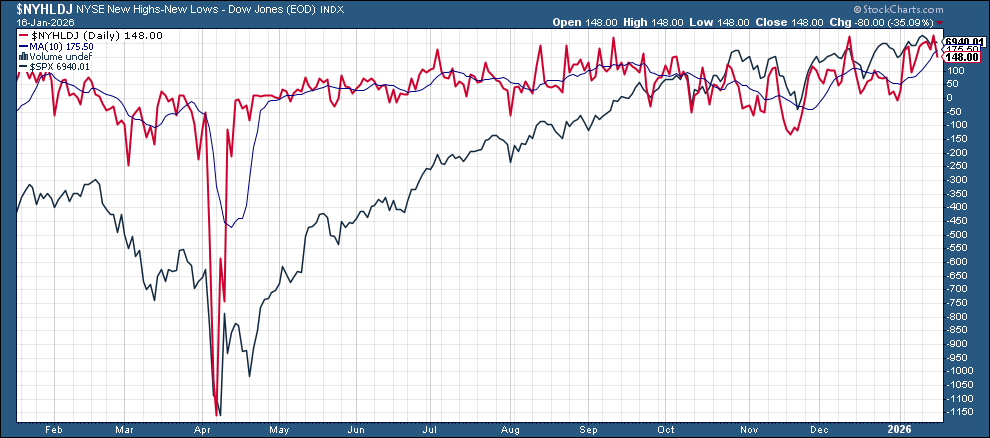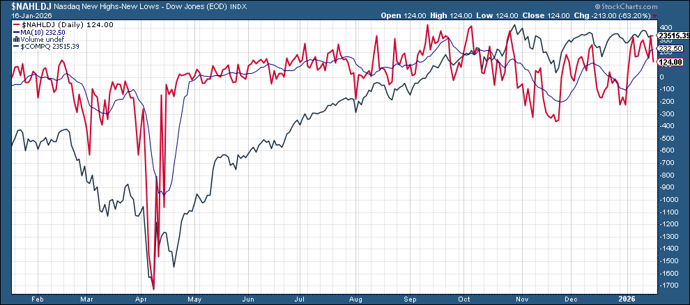 New 52-wk highs minus new 52-wk lows (red lines) fell back to 148 from 227 on the NYSE, which was the best since Nov ‘24, while the Nasdaq fell to 122 from 335, the best since Oct.