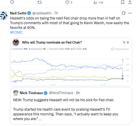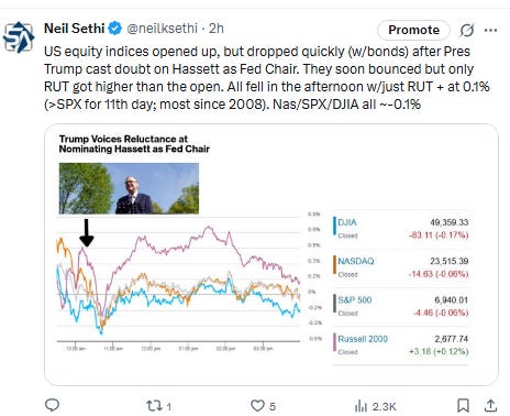 The reasoning for the move is a little odd, though, as Hassett was seen as the least independent of the Fed Chair candidates, and Warsh has been quite hawkish throughout most of his career (including as a Gov at the Fed) before he turned more dovish when he became a candidate for the top job.