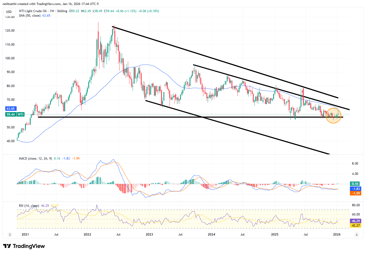 Weekly chart has better technicals but remains capped by the top of the channel.