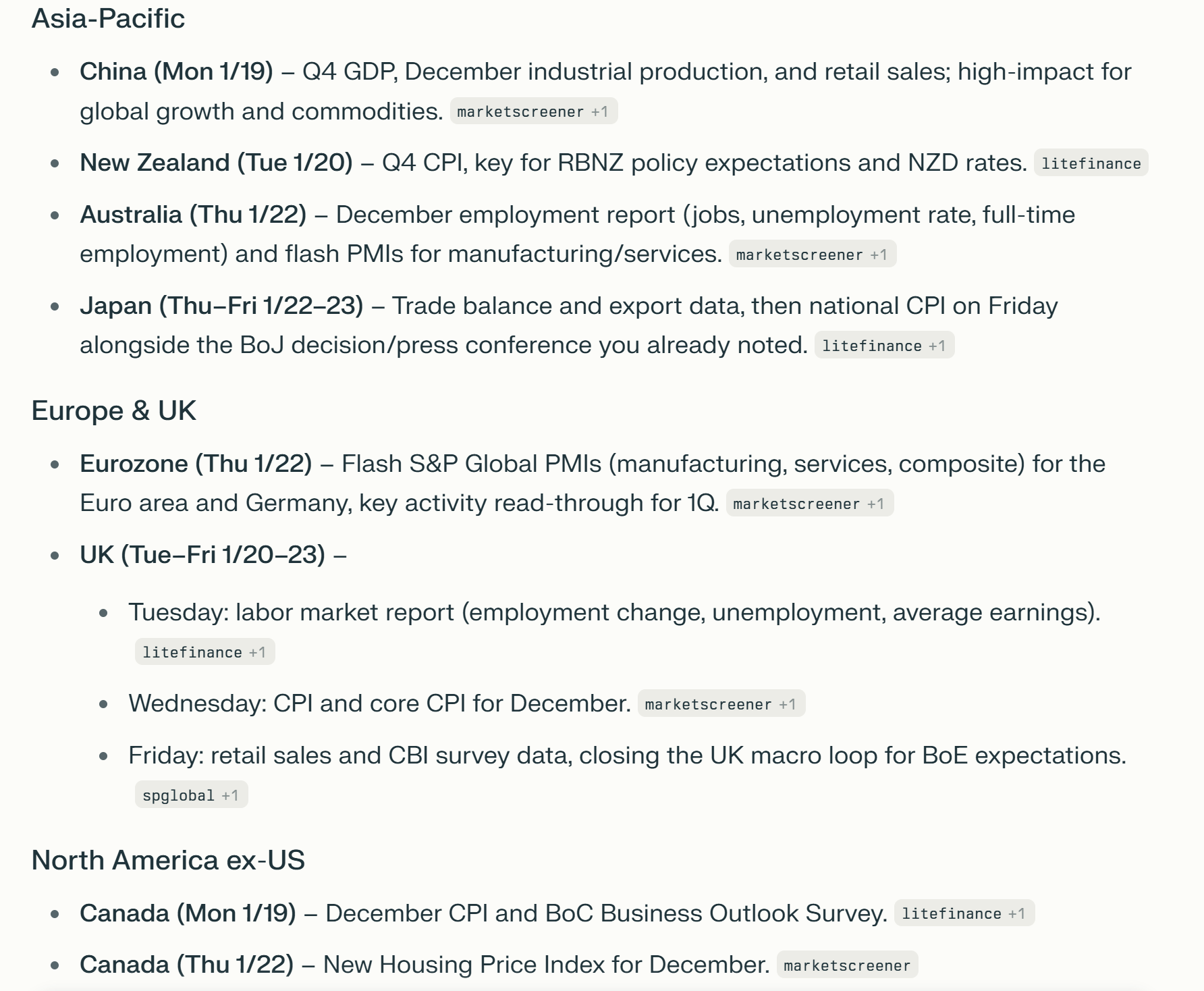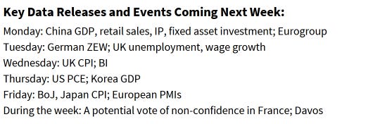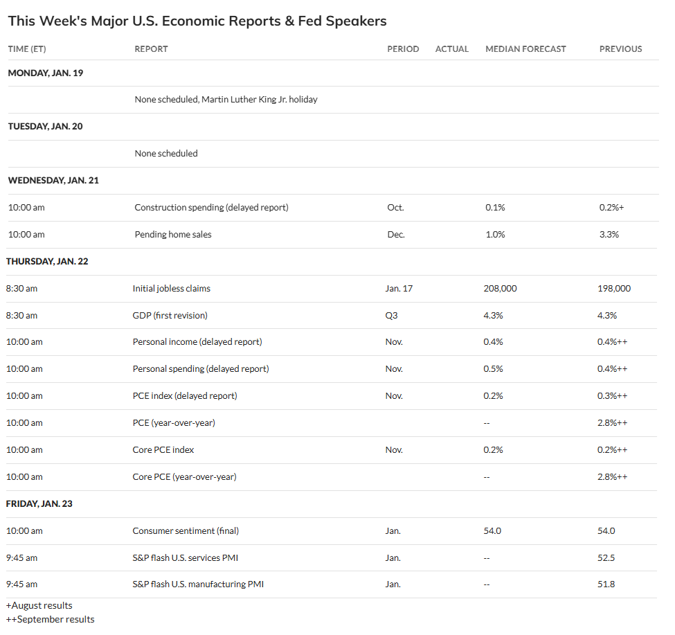 It’s a holiday shortened week (Monday all US markets are closed for Martin Luther King Day). It’s also a lighter week as is often the case for the third week of the month, although we will get a couple of normally more important reports that are delayed in the Nov personal income and spending report which includes PCE prices (the Fed’s preferred inflation indicator) as well as the first revision (and I think only revision in this case) to 3Q GDP.
