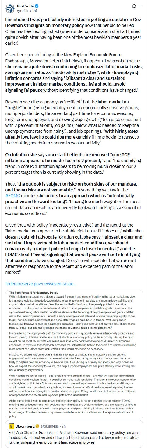 After #FOMC rate cut pricing fell Thurs to the least since pricing for the contract was initiated (or at least as far back as the CME Fedwatch tool has been tracking it), it fell a little more Fri with mixed Fedspeak (a dovish speech from Gov Bowman set against a less dovish one from VC Jefferson (which I’ll cover this weekend).