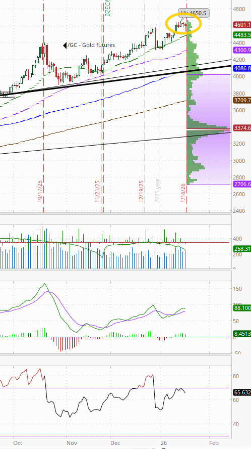 Gold futures (/GC) continued their pattern of a little breather after a move higher trading sideways for a fourth day just off their all-time high. Daily MACD remains in “go long” positioning, while the RSI is over 60.