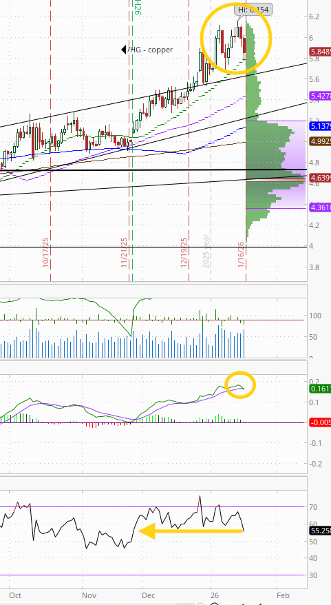 US copper futures (/HG) also continuing their more stairstep pattern falling back further from all-time highs. But the daily MACD has crossed to “sell longs” positioning while the RSI has fallen to the least since Nov, so we’ll see if a deeper pullback is in the cards.