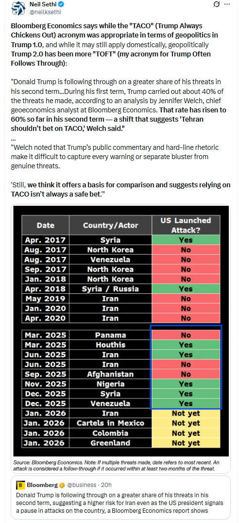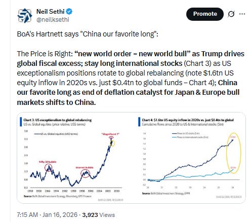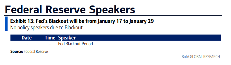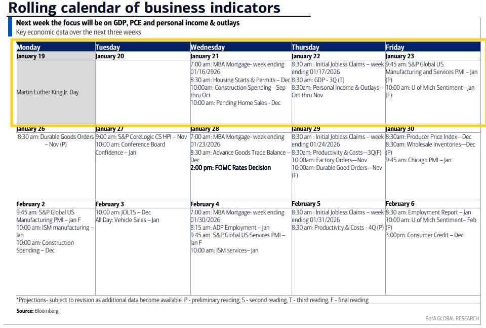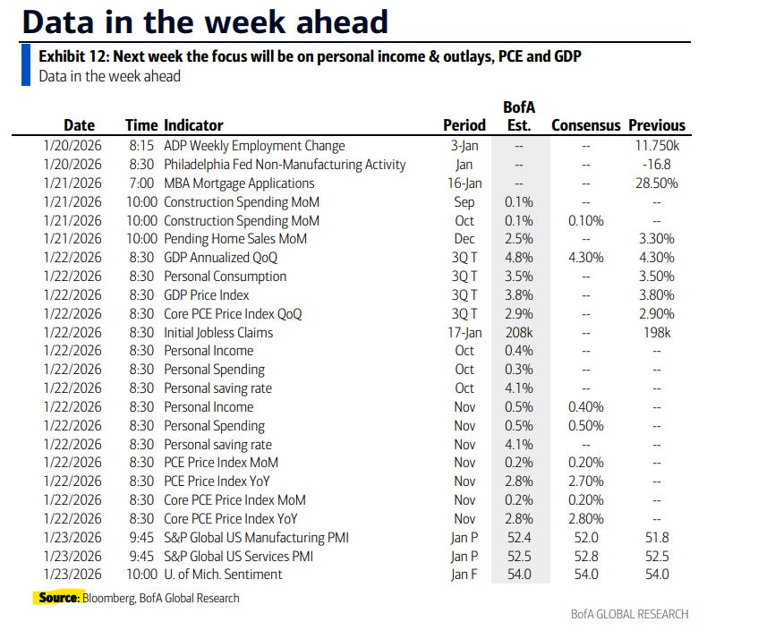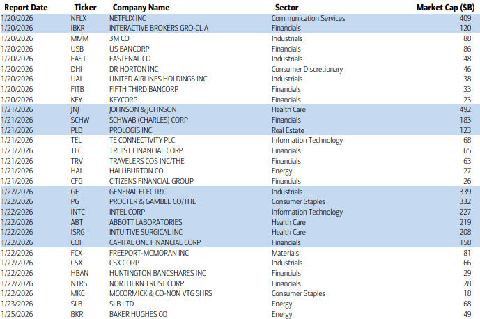 Q4 SPX earnings season picks up next week with 30 SPX reporters (although again 7% of SPX by earnings weight, the same as this last week), 11 of which are over $100bn in market cap in NFLX, IBKR, JNJ, SCHW, PLD, GE, PG, INTC, ABT, ISRG, COF (in order of reporting date).
