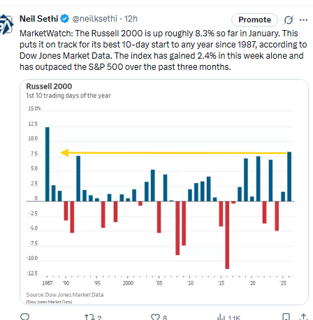 “There’s a new king of the hill to start 2026,” said Brian Jacobsen at Annex Wealth Management. “Instead of large‑cap growth, small‑cap value is taking the crown. After years of head‑fakes — moments when it seemed big‑cap tech’s dominance might finally give way to broader market participation — the long‑anticipated ‘Great Rotation’ may finally be taking shape.”