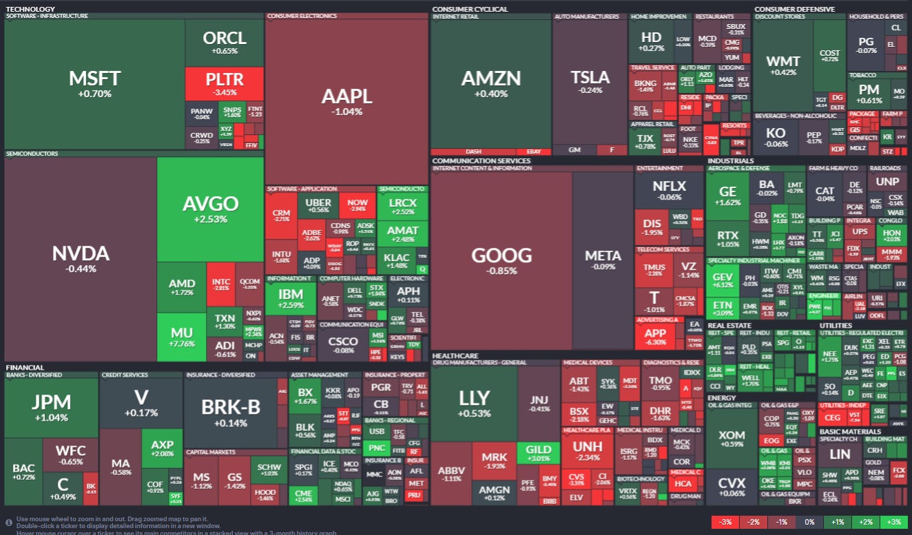 13 SPX components were up 3% or more (after 40 Thurs, 25 Wed, 17 Tues, 15 Mon, 45 a week ago). Super Micro SMCI led +10.9%. Four of those 13 up 3% or more were >$100bn in market cap (after 3 of 11 Tues, 4 of 25 Wed) in MU, GEV, ETN, GILD (in descending order of percentage gains).