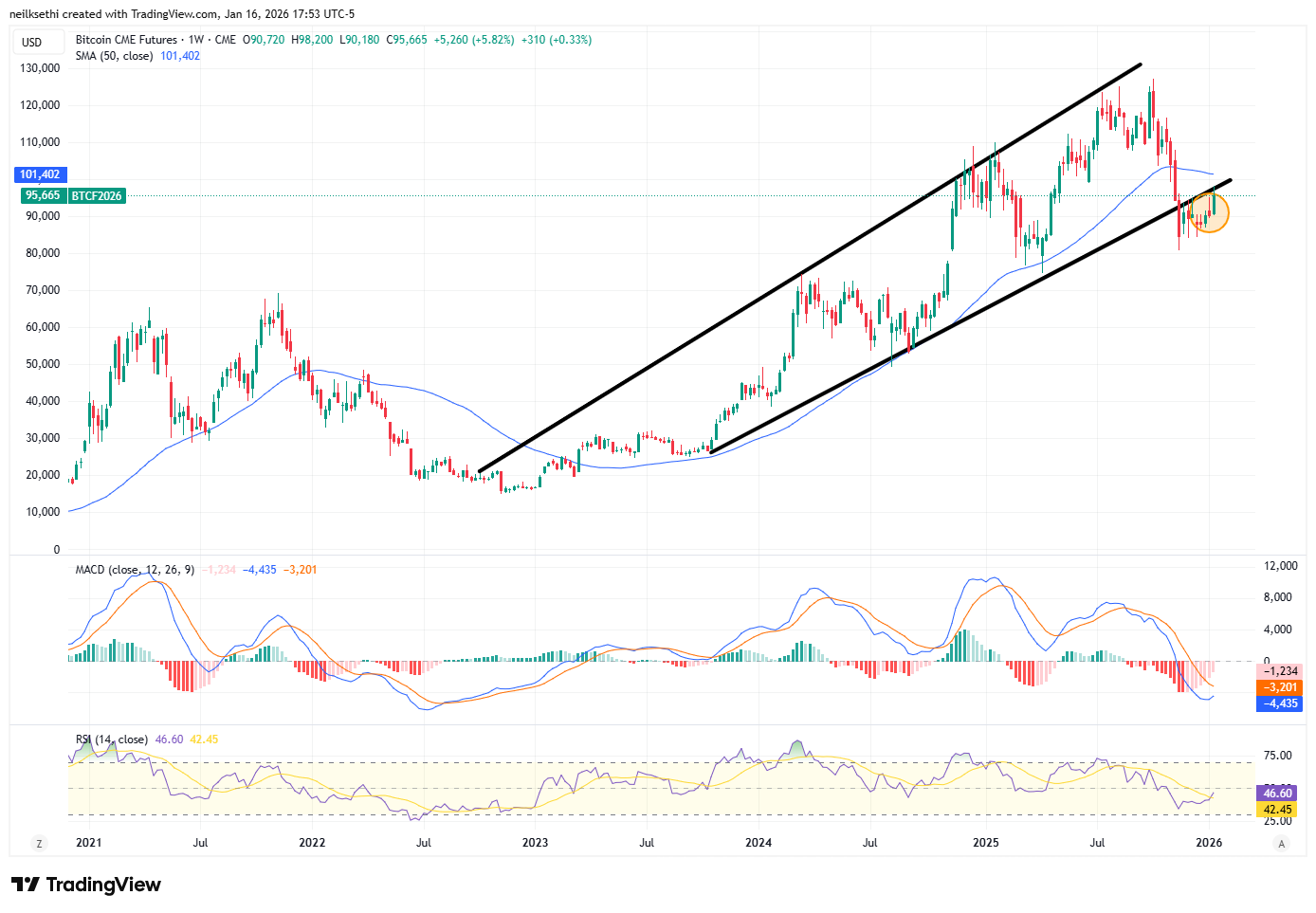The daily MACD still remains in “cover shorts” positioning (positive), while the RSI is over 50 so I continue to expect them to at least test that $100k level.